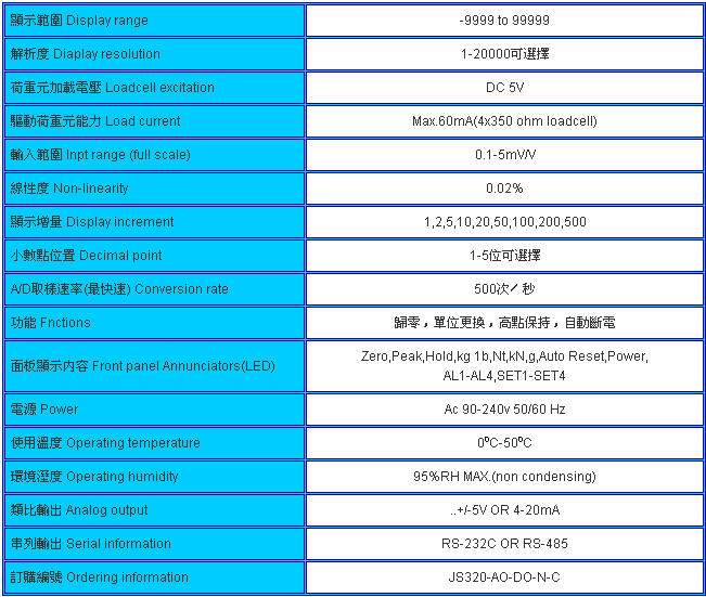 產品介紹:1982年,臺灣JIHSENSE公司初期以精密加工為主要業務,至1987年有感於國內力量感測器荷重元(Loadcell)昂貴的售價及冗長的交貨期將不利於未來自動化及高精密度機器設備的發展,於是毅然投入研發,並自國外及國內研究單位吸收各項相關技術,經過兩年的研究發展,終於在1989年(民國78年)成功開發出JS-320荷重顯示器,臺灣JIHSENSE JS-320_JS-320稱重顯示控制器(產品技術規范見下圖)