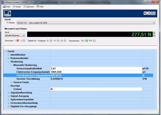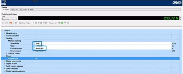靈敏度可以在CMD Assistant軟件中設定。 在“傳感器靈敏度” 欄中設定。然后您可以定義 "物理輸入范圍"。這是個測量范圍,輸入你希望測量的最大力。如果以后有一個更大的力,CMD 不會提供電壓輸出。設定CMA. 按以上計算,靈敏度為 3.801 pC/N ,應用的測量訪問為500 N. CMD 對應 500 N 的輸出為 10 V。