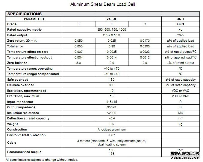 美國Tedea 3310稱重傳感器量程:3310-250kg、3310-500kg、3310-750kg、3310-1000kg。